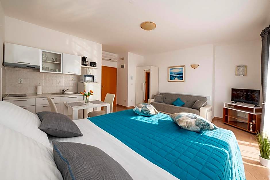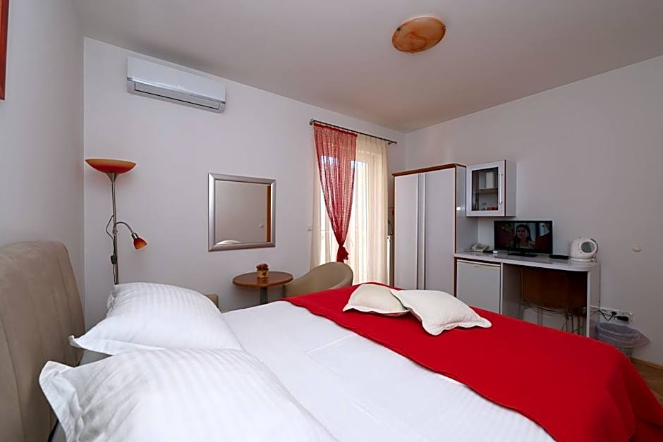 This studio apartment is on the 1st floor on the front side of the hotel, with access to a balcony. Comes with a sofa bed, table, chairs and kitchen.